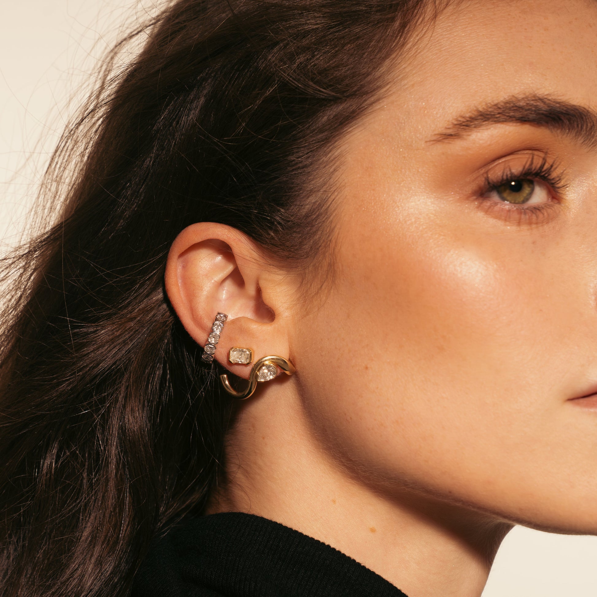 The Coquette Curve hugs the lobe in a sculptural sweep of gold, anchored by a 0.50 CT lab-grown pear diamond. It’s intentionally shaped to follow your ear—not just sit on it—making it the go-to when you want your jewelry to have a point of view.