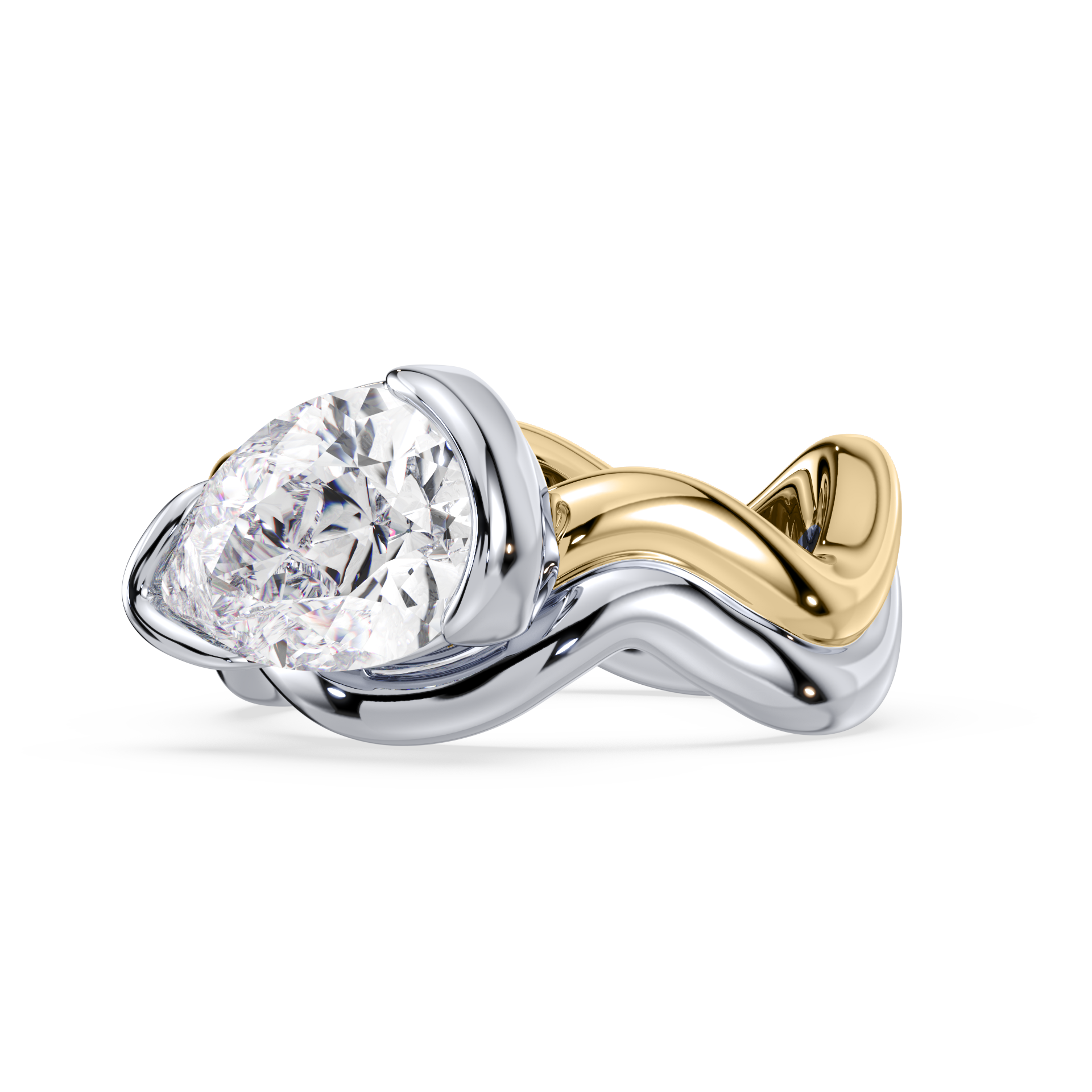 The two-tone band shifts depending on your diamond choice. The white diamond option pairs crisp mixed metals for high contrast and edge. The yellow diamond option leans warmer, designed to enhance the diamond’s depth and richness. Both are finished with our signature scalloped comfort-fit band and chunky half-bezel that frames the stone from every angle.