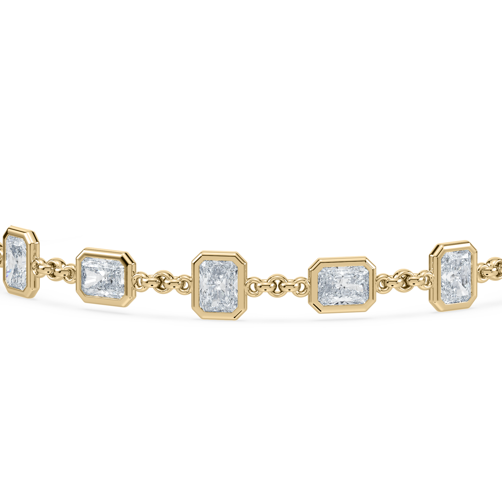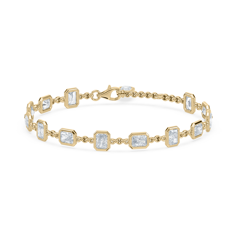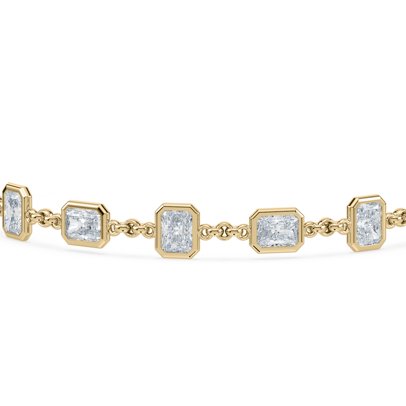 The Deco Step Bracelet brings architectural rhythm to a classic silhouette. Each radiant-cut diamond is bezel-set in 14K gold, creating a sequence of bold, geometric forms that feel sculptural yet wearable. Refined structure meets effortless luxury, making it a modern heirloom designed to stand out in any stack.
