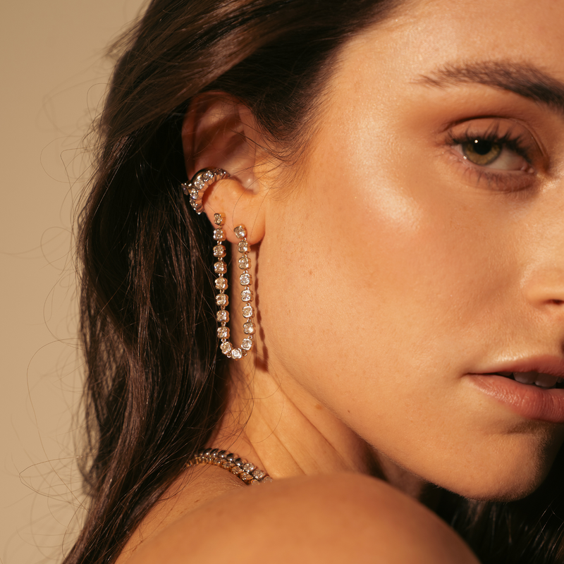 The Muse Double Drop connects two piercings with a continuous line of lab-grown cushion-cut diamonds—structured, sculptural, and impossible to ignore. Spanning 3.5 inches from top to bottom, this piece drapes across the ear with clean geometry and bold shine.