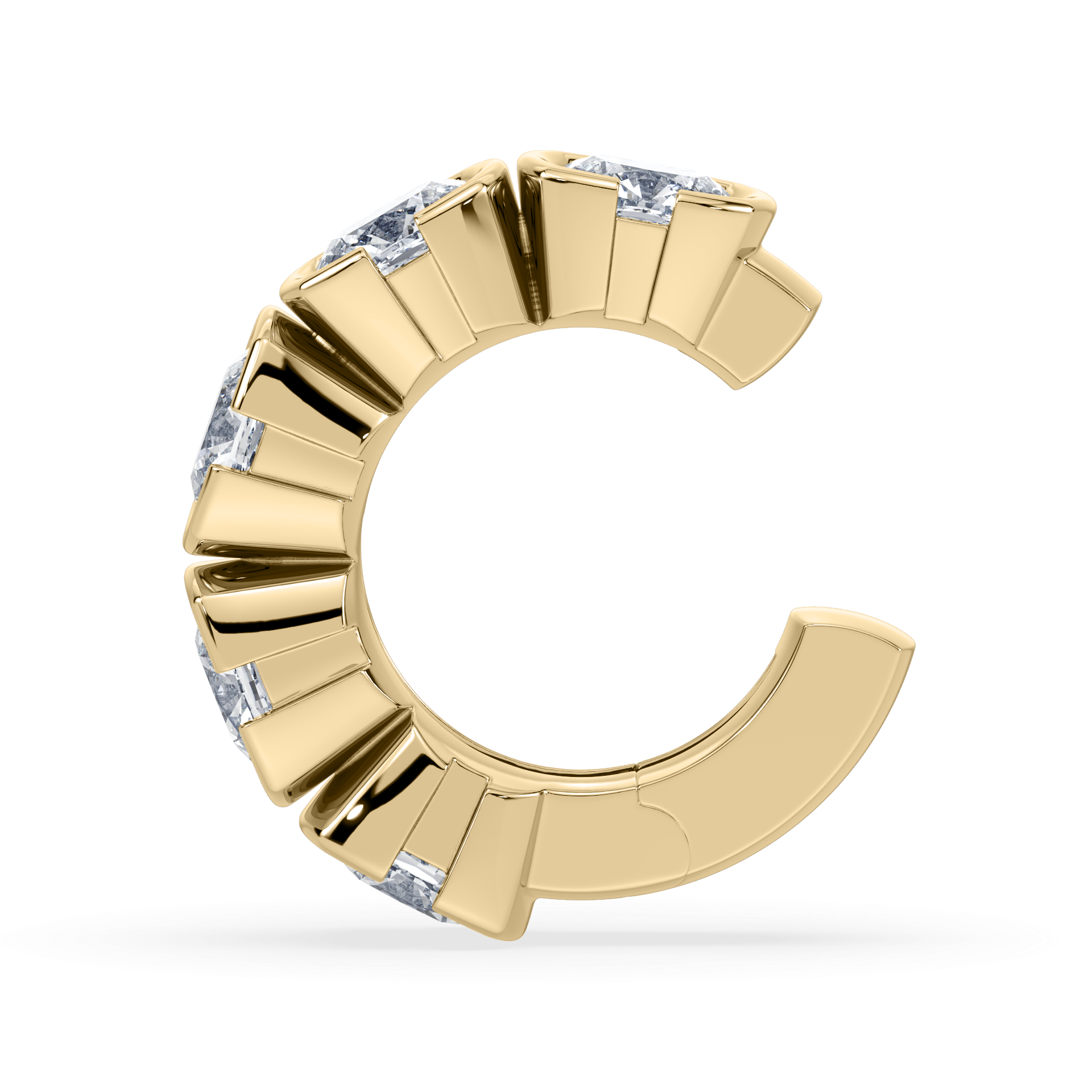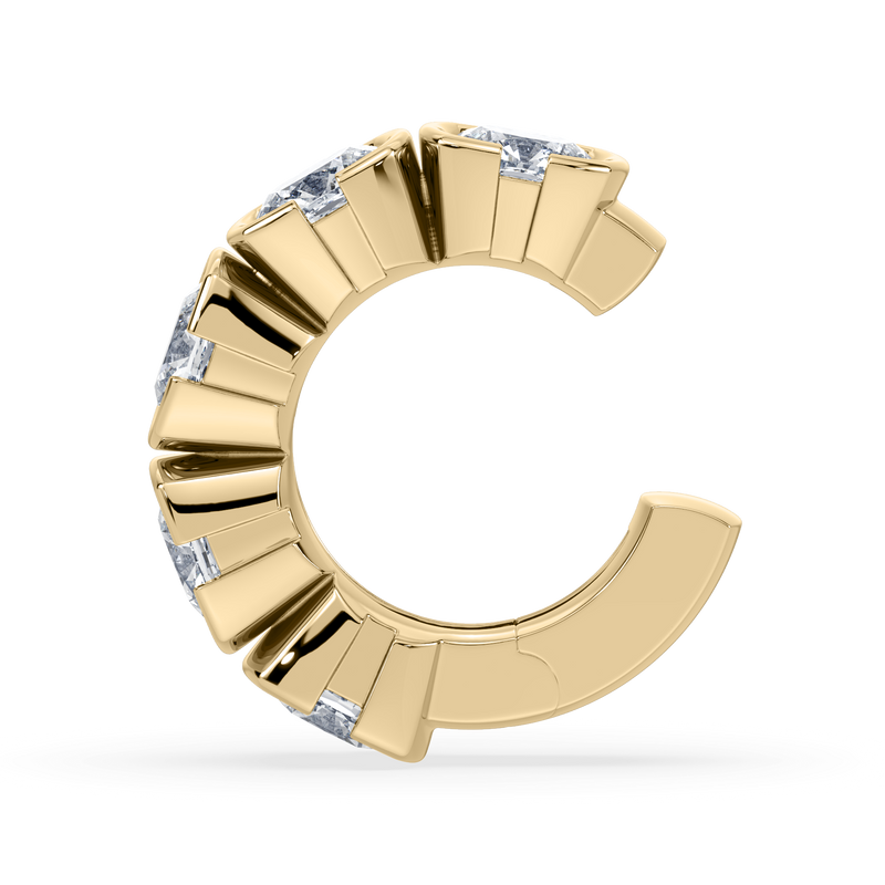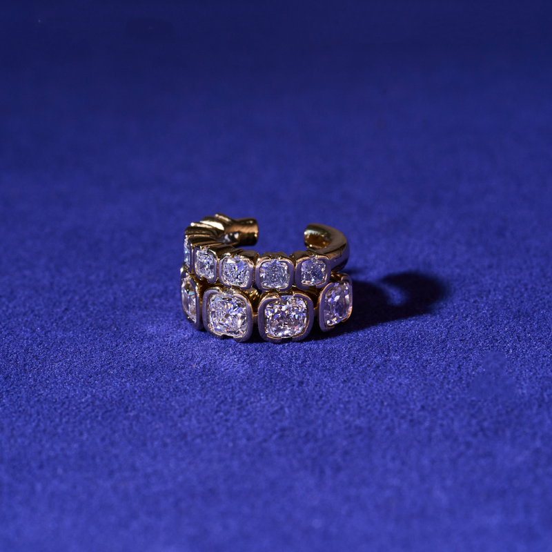 The Muse Mega Cushion Ear Cuff takes our signature silhouette and scales it up for maximum impact. Featuring five oversized cushion-cut lab-grown diamonds in full bezels of 14K gold, it’s bold, sculptural, and unmistakably SETTE. A concealed hinge allows for easy wear and a secure, comfortable fitβ€”no piercing required. Elevated yet effortless, it’s the power move your ear stack has been waiting for.